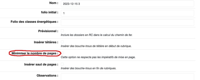 Cocher la case pour avoir le maximum des modules mis sur des pages pêle-mêle, mais en général il faut tout recommencer (sinon il y a parfois un module par page et ça en fait beaucoup à supprimer). Quand on ne connaît pas le folio du début du CDF, on laisse comme flio initial : 1.