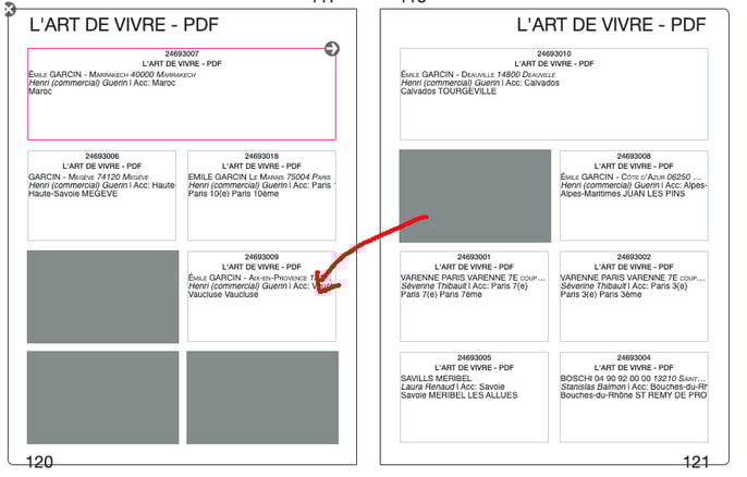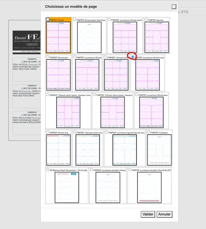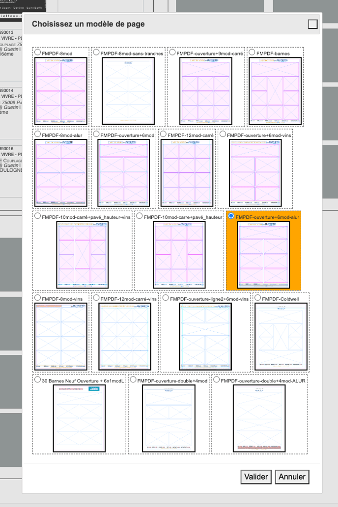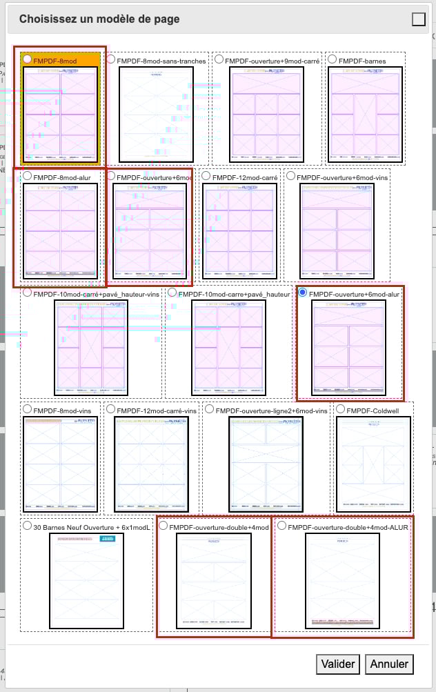 Quand vous double-cliquez sur cette zone bleue, une fenêtre s'ouvre pour proposer les différents types de pages disponibles dans le Figaro Magazine. En rouge, les modèles utilisés pour les pages multiproduits. Les autres sont plus pour les pages monoproduit ou semi-corpo (dédié à un seul client) tel Garcin, Mercure, Besse...