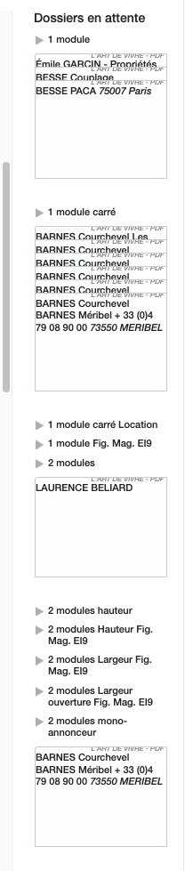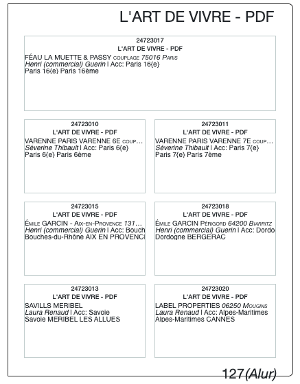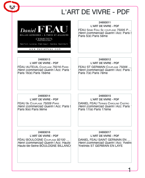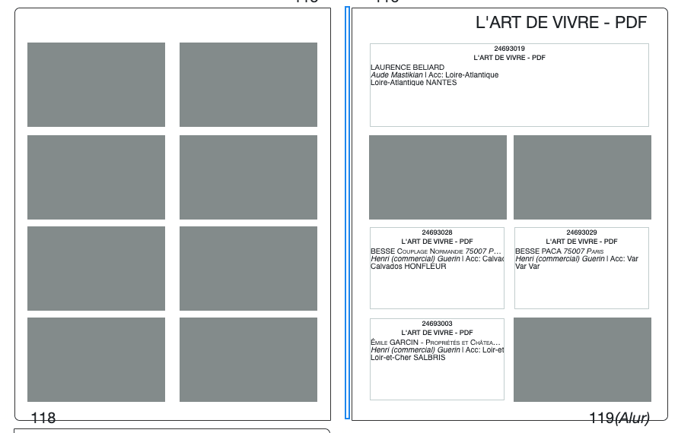 Pour information, la première page des multiproduits est toujours la page qui reprend la mention de la loi ALUR, il faudra donc choisir un modèle avec la mention ALUR (soit une page avec une accroche, soit 2 modules en haut, ou une page avec 2 accroches). L'info ALUR est repris à côté du folio.