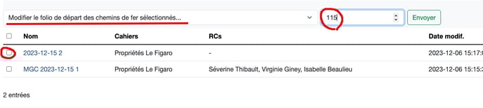 Retournez dans la liste des chemins de fer, sélectionner/cocher le chemin de fer concerné, sélectionnez dans le menu déroulant au-dessus "Modifier le folio de départ..." et tapez le nombre qui vous intéresse en "Envoyer".