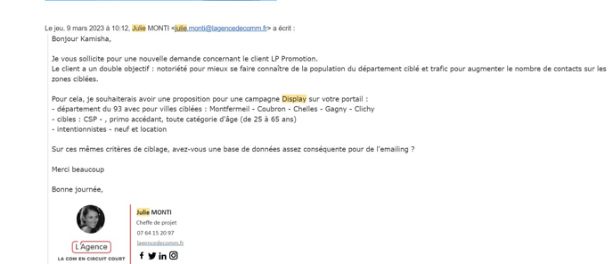 Etape 8 : Après programmation, envoi (facultatif) d'un mail récapitulatif à Equipe trafic avec nom client, site concerné, ciblage géographique pour les notifier.