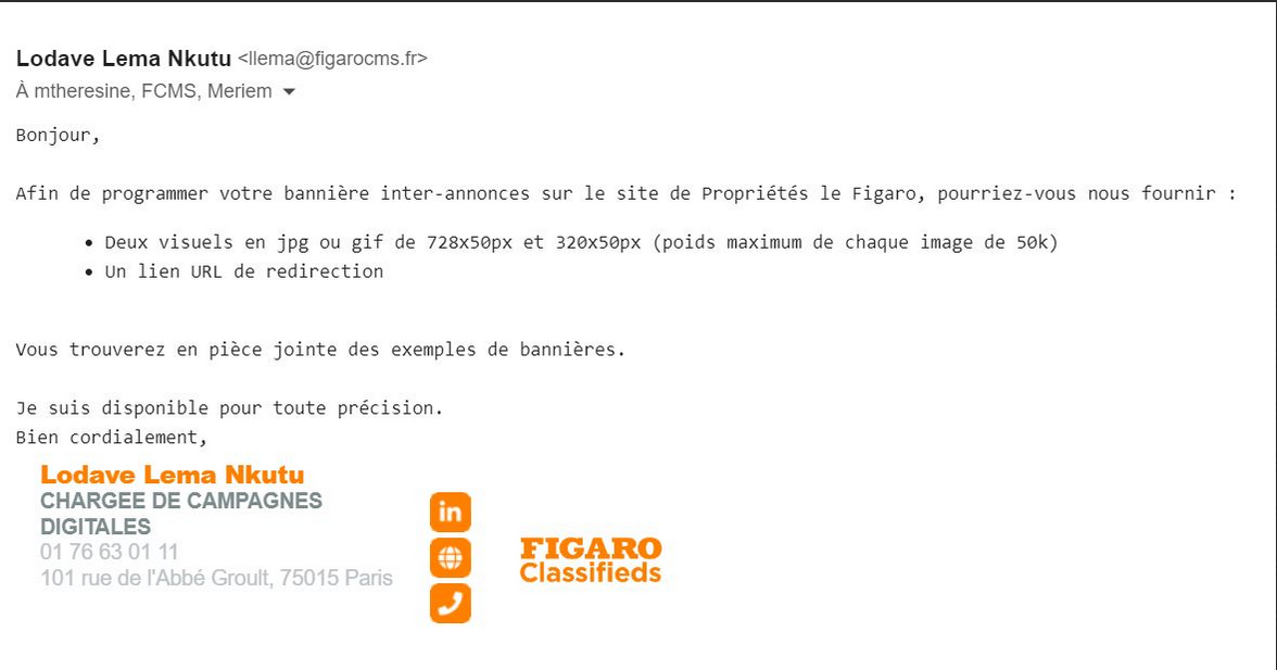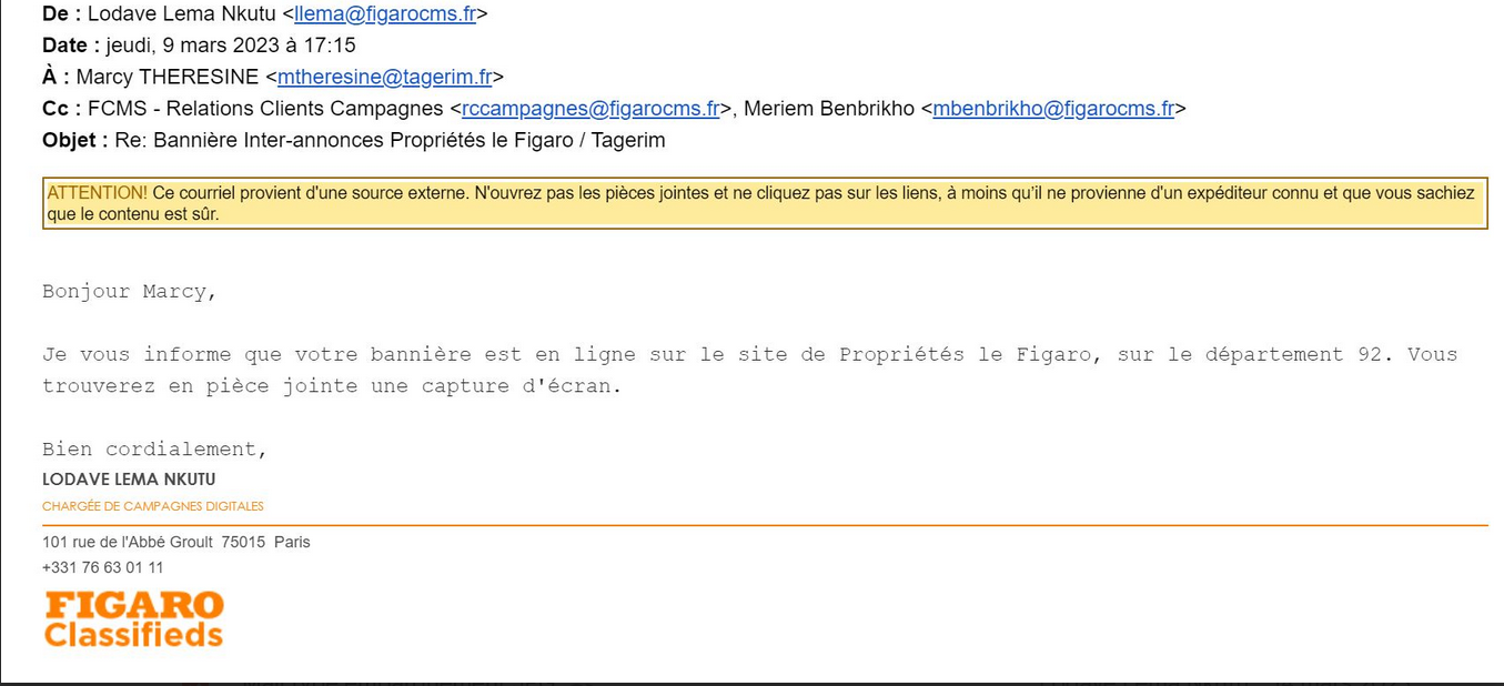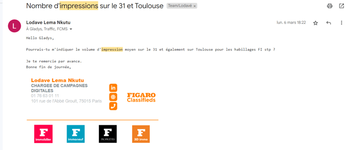 Si nombre d'impressions demandé par le client, voir avec le trafic (Gladys Chateau + équipe trafic en copie, _trafficmanagement@figarocms.fr )