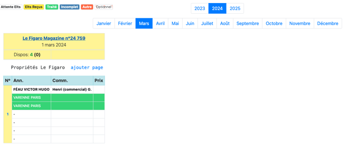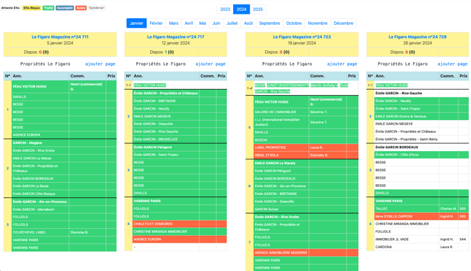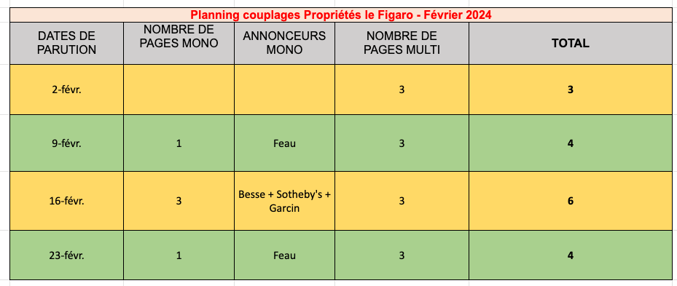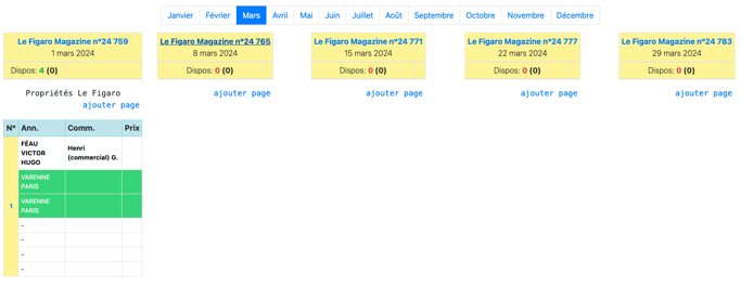 Un planning par mois est envoyé au 15 du mois précédent (par exemple : 15 novembre pour le tableau du mois de décembre). Et pour chaque page ajoutée pour une future édition, il faut prévenir Christelle Lallouette (clallouette@media.figaro.fr) et lui renvoyer le planning du mois modifié. C'est avec elle aussi que nous enregistrons les pages prévues dans chaque numéro du Figaro Magazine.