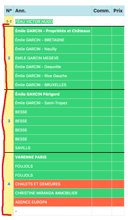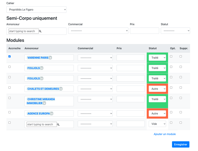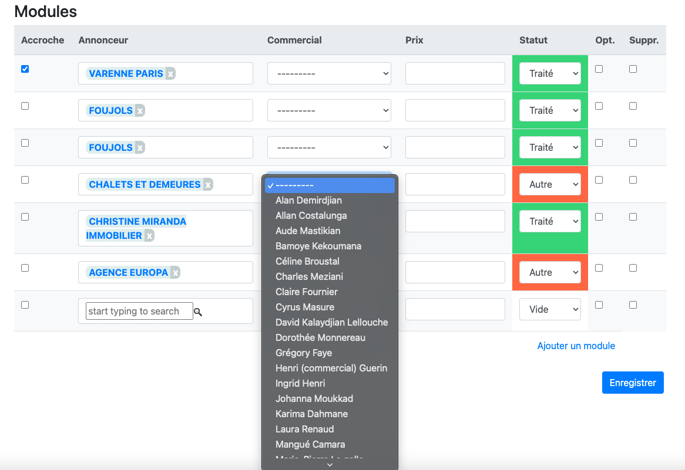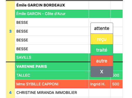 De base, le tableau est blanc. En cliquant sur la zone "Commercial", sur le tableau, sur la ligne qui vous intéresse, vous pouvez faire apparaître le petit menu déroulant et changer la couleur de la ligne ou la X pour sortir. "Autre", c'est en fonction de chaque situation : annonce pas complète, problème photo, mettre l'annonce en ligne...