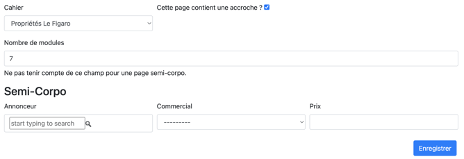 Différentes informations sont à remplir dans ce tableau : l'annonceur, le commercial et le prix de l'annonce (si connu). Pour cela, il suffit de cliquer sur le numéro de la page en question, pour une page déjà existante (ici en bleu donc cliquable, de 2 à 4).