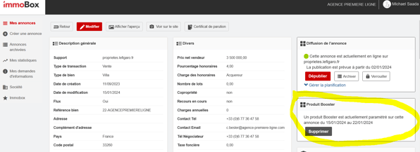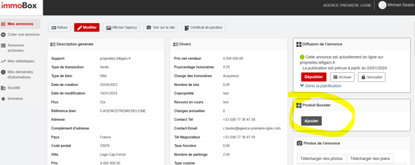 Le client se rend sur son espace Pro, rentre dans l'annonce PLF et clique sur le bouton "Ajouter" dans le cadre Booster qui apparait sur la droite