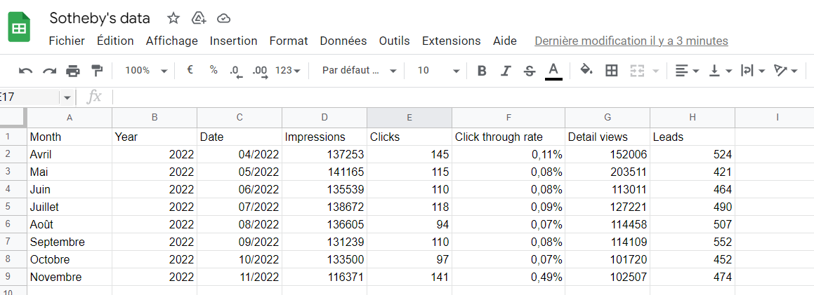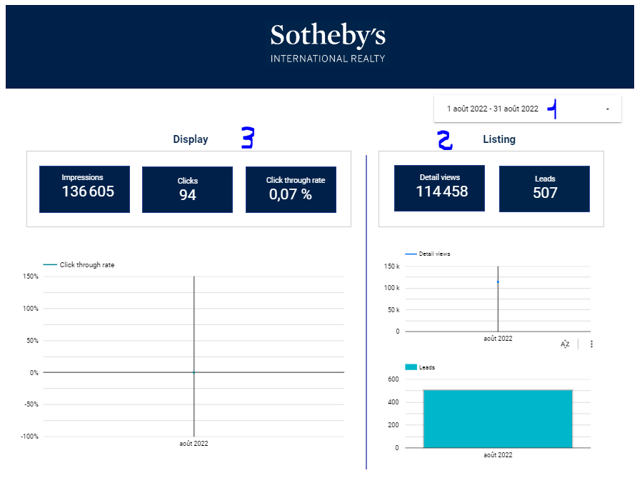 Nous mettons à disposition de Sotheby's un dashboard regroupant à la fois les statistiques des annonces et du display. Ce tableau est mis à jour chaque début de mois par la relation client.
