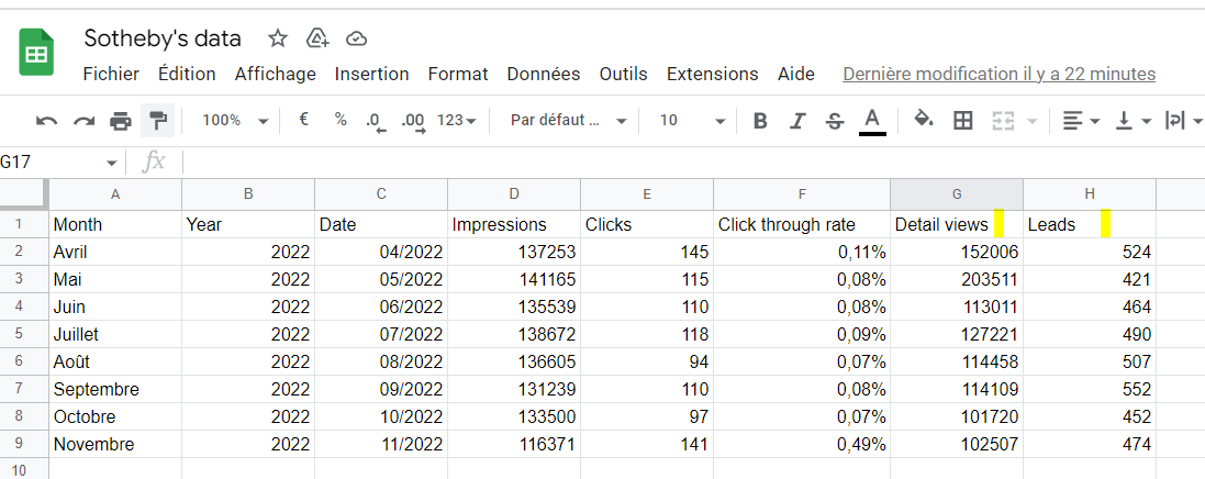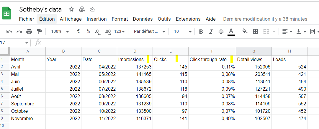 4) Insérer les chiffres du mois dans les colonnes Detail views et Leads du fichier Excel
