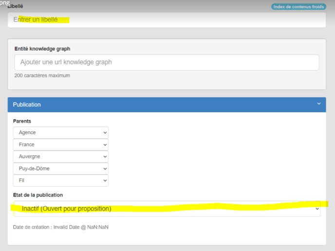 - Renseigner le nom de la ville dans Libéllé / Passer l'état de la Publication en "Actif" / Enregistrer